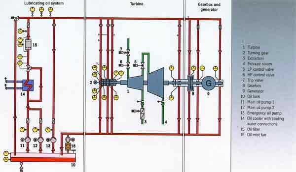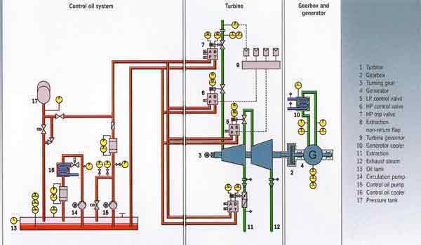 Apart from the control valves, the system also feeds the live steam trip valve, the extraction with a system pressure of 160 bar, commonly used for hydraulic systems. |